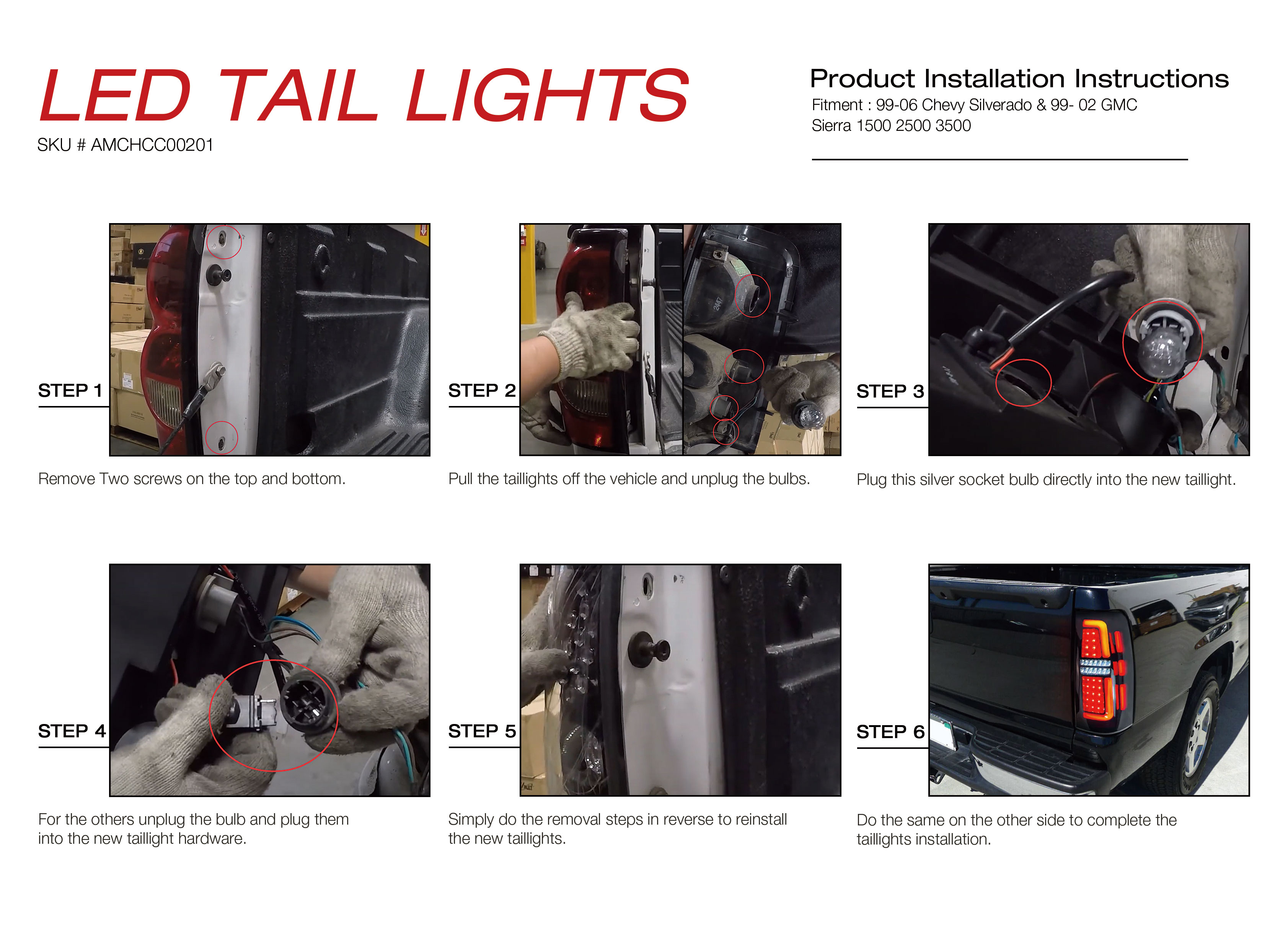 Video Product Specification Part# AMCHCC00201 Package Dimensions: 9.45* 22.45*12.59 inch Package Weight: 20.79 Ibs Features Unique American Modified Designs Enhance the look of your car Durable housing with scratch resistant lens Brighter but lower power consumption Higher visibility and fast switch response for your driving safety LED Function: Brake/ Parking/ Turn Signal Descriptions Unique Design: Bringing an exquisite style to the back of your trunk. With all LED design and higher brightness Superior, Lasting Visibility: Added Safety While Bringing a New Modern Look to your Vehicle with Brighter, More Efficient Lighting High quality: Our Lights Use the Highest Quality Butyl Sealant to Prevent any Imperfections to Enter the Light Housing Easy Installation: Direct replacement of the original taillights. Professional Installation is recommended Fitment 1999-2006 Chevy Silverado 1500 / 2500 2001-2006 Chevy Silverado 1500 HD / 2500 HD 2001-2006 Chevy Silverado 3500 1999-2002 GMC Sierra 1500 / 2500 2001-2002 GMC Sierra 3500 Package 1 Pair of Tail Lights