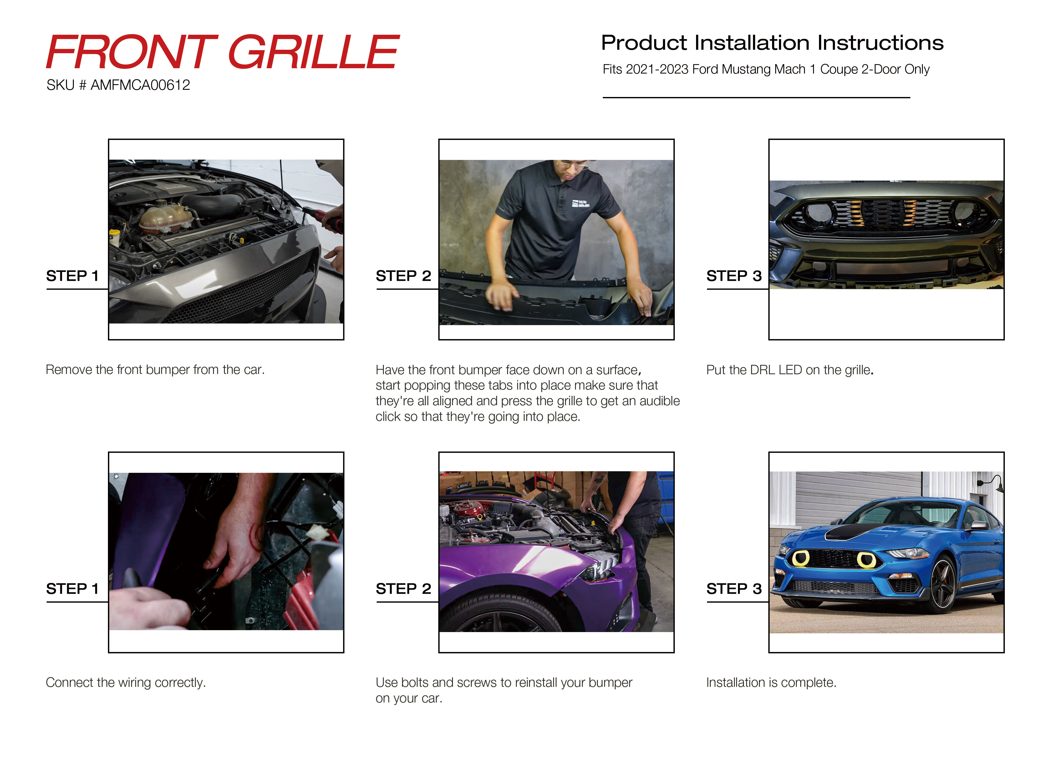 Installation Instructions Video Wiring Instructions Video Product Specification Part# AMFMCA00612 Package Dimensions: 47.05*10.63*7.48 inch Package Weight: 7.05 Ibs Features Made Of Top-grade ABS Material Durable And Lightweight Super White Running DRL Light With Amber Color Turn Signal Lights Increase Air Flow To The Engine Bay With This Bigger Mesh Design And Through The 2 Halo Rim See-Through Ducts. This Not Only Enhance The Look And Performance Of The Car, It Also Enhance The Safety By Adding Better Visibility Of The Car During Foggy Weather Easy To Install, Wiring Work Is Required For LED Rims Installation Instructions Not Included, Professional Is Recommended Fitment Fit 2018-2023 Ford Mustang GT And EcoBoost Models Package 1 x Front Upper Grille 2 x LED DRL Turning Signals