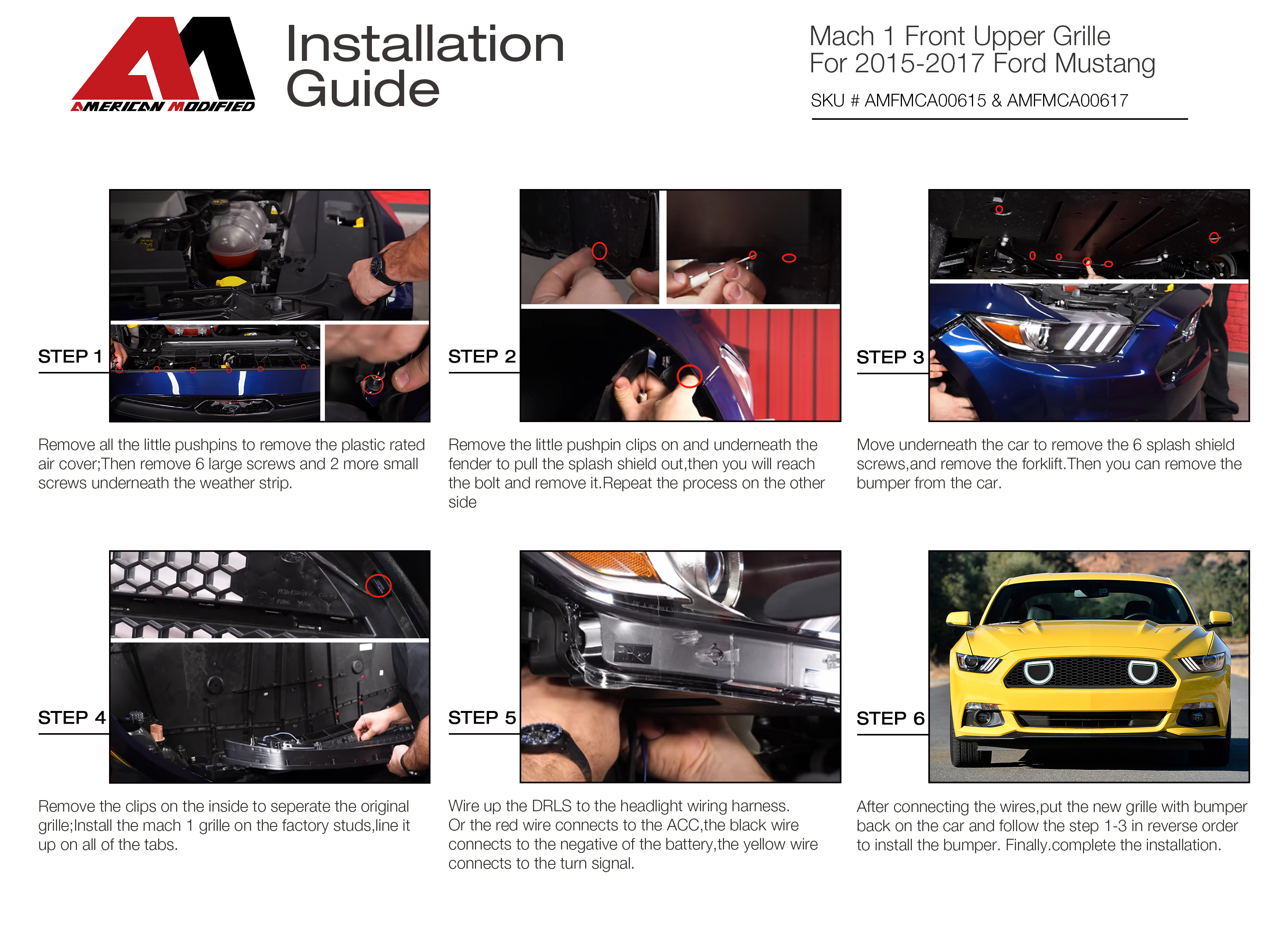 Unboxing & Display Quick Install Product Specification Part# AMFMCA00615 Package Dimensions: 44.69*10.24*5.12 inch Package Weight: 5.4 Ibs Features Made Of Top-grade ABS Material Durable And Lightweight Super White Running DRL Light With Amber Color Turn Signal Lights Matte Black Increase Air Flow To The Engine Bay With This Bigger Mesh Design And Through The 2 Halo Rim See -Through Ducts. This Not Only Enhance The Look And Performance Of The Car, It Also Enhance The Safety By Adding Better Visibility Of The Car During Foggy Weather Easy To Install, Wiring Work Is Required For LED Rims; Installation Instructions Not Included, Professional Is Recommended Fitment Fits 2015-2017 Ford Mustang GT, EcoBoost And V6 Package 1 x Front Upper Grille 2 x LED DRL Turning Signals