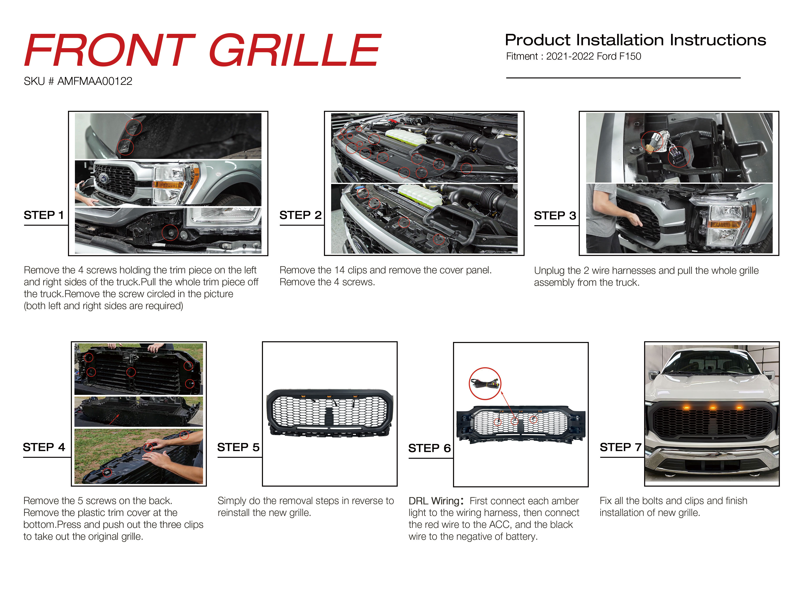 Video Product Specification Part# AMFMAA00122 Package Dimensions: 53.94*18.9*7.68 inch Package Weight: 11.02 Ibs Feature Mean, Aggressive Styling Paintable, Black Primed Finish Made Of Light Weight & Top-Grade Durable ABS Material With 3 Amber Led Lights Unique Mesh Design To Increase Airflow Direct Fit Replacement Grille Simple Straight Forward Installation Fitment: Fit 2021-2024 Ford F150 ( Excluding Raptor ) Descriptions Mean, Aggressive Styling: The stylish grille aggressively enhances the appearance to make your car stand out from the crowds.
