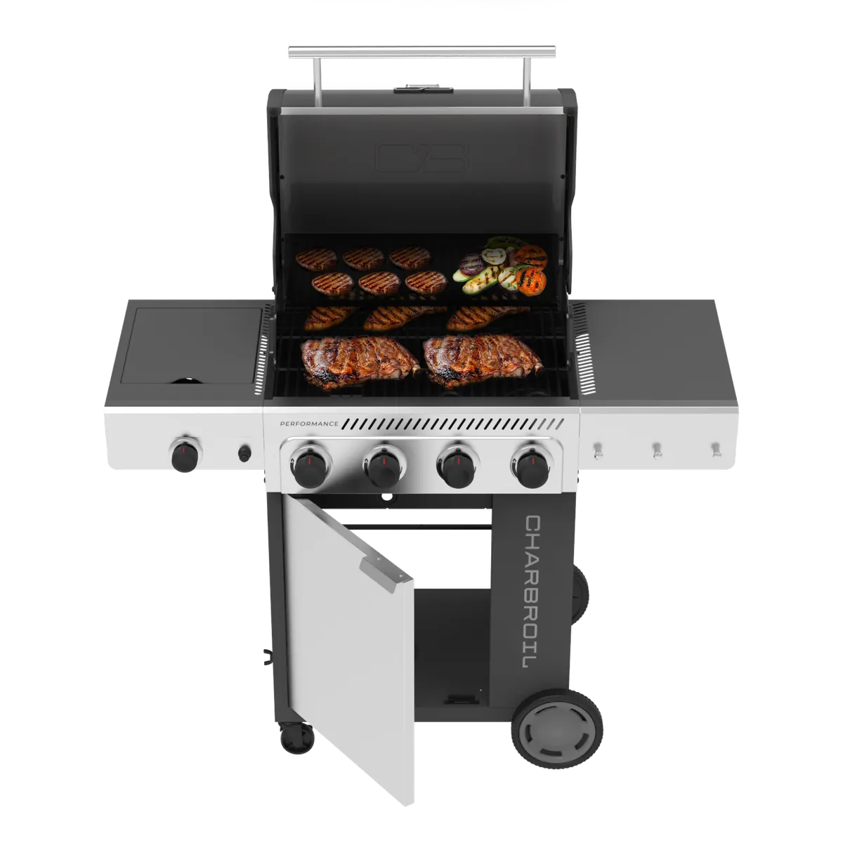 Sleek, reliable, and social-ready—the Charbroil® Performance Series™ 4-Burner Cabinet Grill in gray stainless makes entertaining effortless. With 435 sq. in. of cooking space plus a warming rack, you’ll have room for mains and sides at once. The FlavorMax™ system ensures even heat and juicier food, while an 11,000 BTU side burner expands your menu options. Porcelain-coated grates resist rust and lock in flavor, while locking casters and a closed cabinet give you storage and mobility. It’s grilling made stylish, simple, and confidence-boosting.