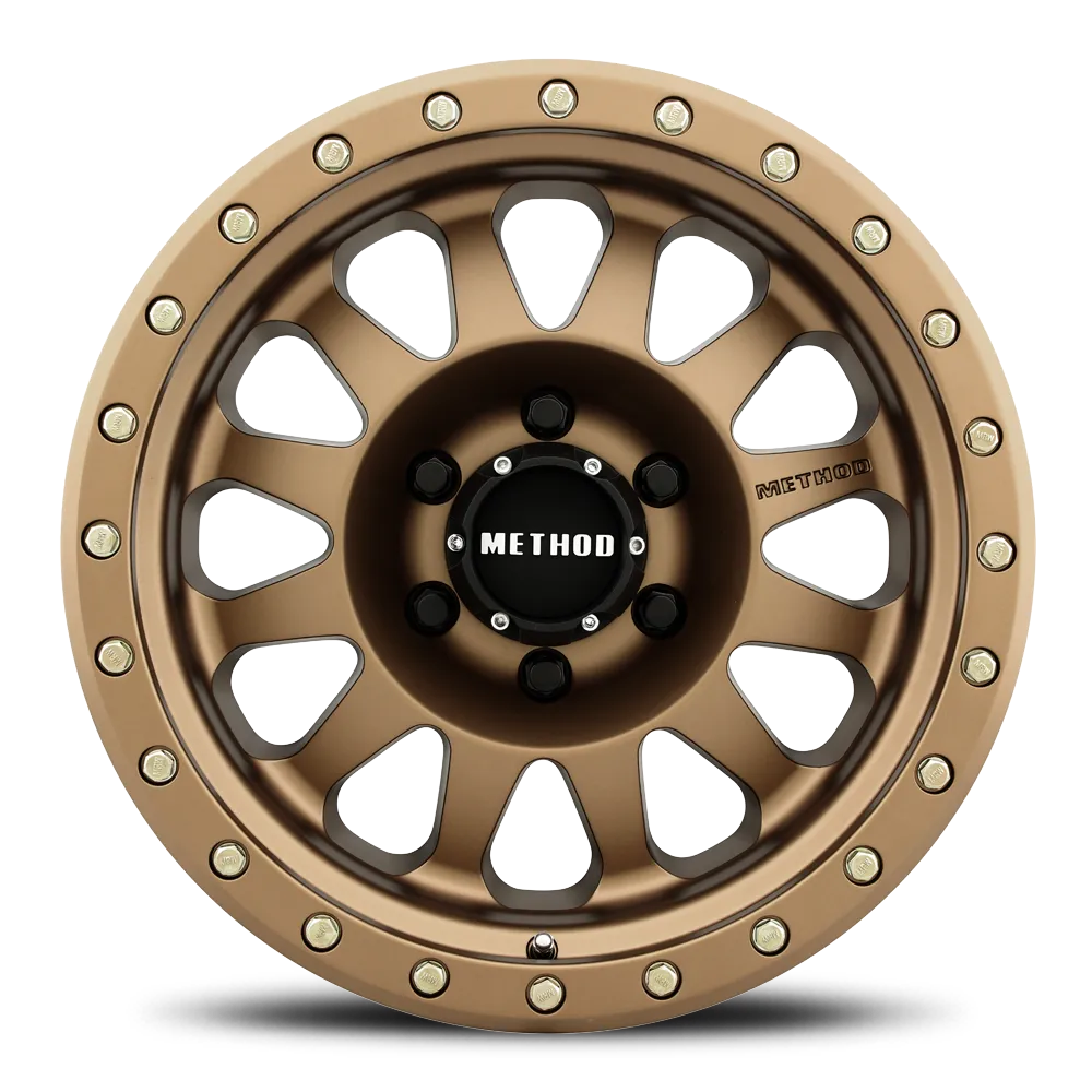 Solid A356 aluminum with T6 heat treatment construction Iconic 12 window design with debossed METHOD logos Street-Loc V.1 lip with undercut simulates true beadlock wheel Replaceable MRW lip bolts with optional colors available Push through center cap with embossed METHOD logo Flush cap appearance options available Industry's best lifetime structural warranty Strong 2500 lbs. to 3640 lbs. load ratings with HD 4500 lbs. applications available Specs Wheel Size: 18x9 Model: Double Standard MR304BRZ Color: Method Bronze Offset: -12 Bolt Pattern: 6 On 139.7 Bolt Circle 1: 139.7 Bore: 108 Lip Size: 3.86 Wheel Diameter: 18 Width: 9 Weight: 31.3 Load Rating: 2500 BSM: 4.5 Material: A356 Aluminum Structure: 1-Piece Lug Type: Conical Exposed Lugs: Yes Lug Count: 6 Replacement Cap: CP-1717B114-S1 Segment: Off-Road, Truck Warranty: Lifetime Structural Warranty Sold As: Each