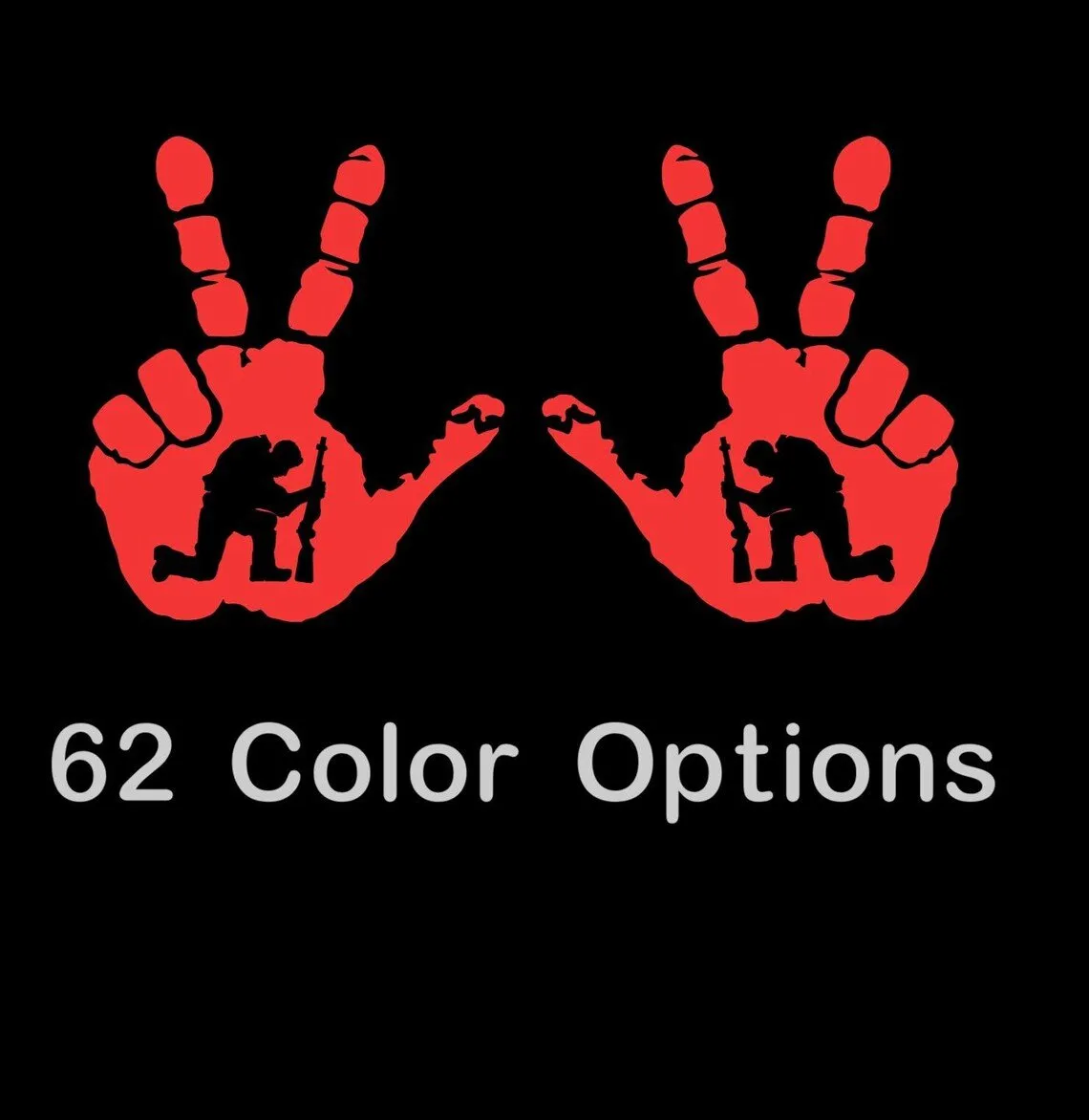 Premium vinyl decal set featuring a kneeling soldier hand wave peace design. Universal fit for Jeep mirrors and body panels. Set of 2 in multiple color options.
