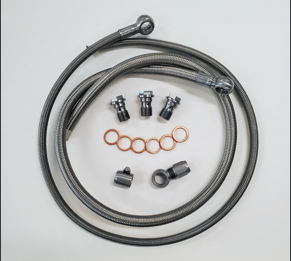 One End Of The Hose Is Factory Crimped To Ease Assembly,This 2 Piece Stainless Hose Kit Has Extra Long 3 in. Hoses That Can Be Trimmed To Final Length,Kit Uses All Stainless Steel Banjo Fittings For Extra Clearance In Tight Spaces