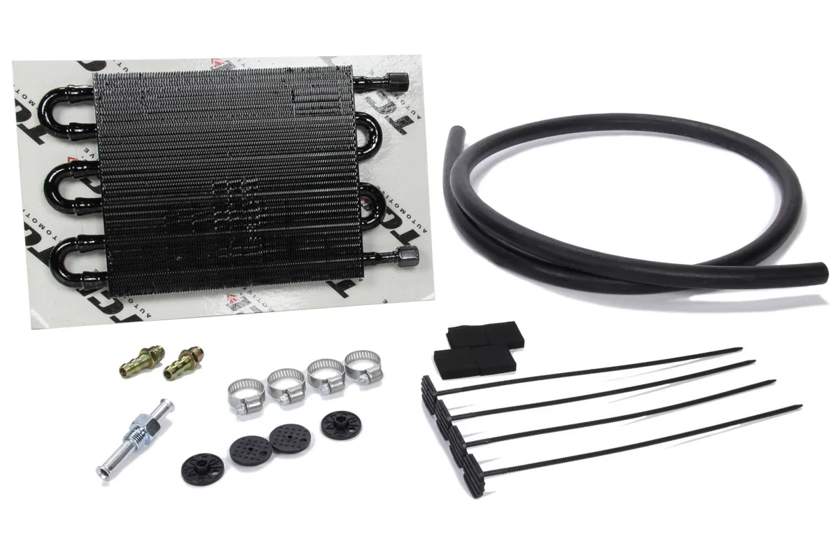 Fluid Cooler - 16.188 x 10 x 0.75 in - Tube Type - 6 AN Female Inlet / Outlet - 11/32 in Hose Barb Adapters - Fitting / Hardware / Hose - Aluminum - Black Paint - Automatic Transmission - Kit