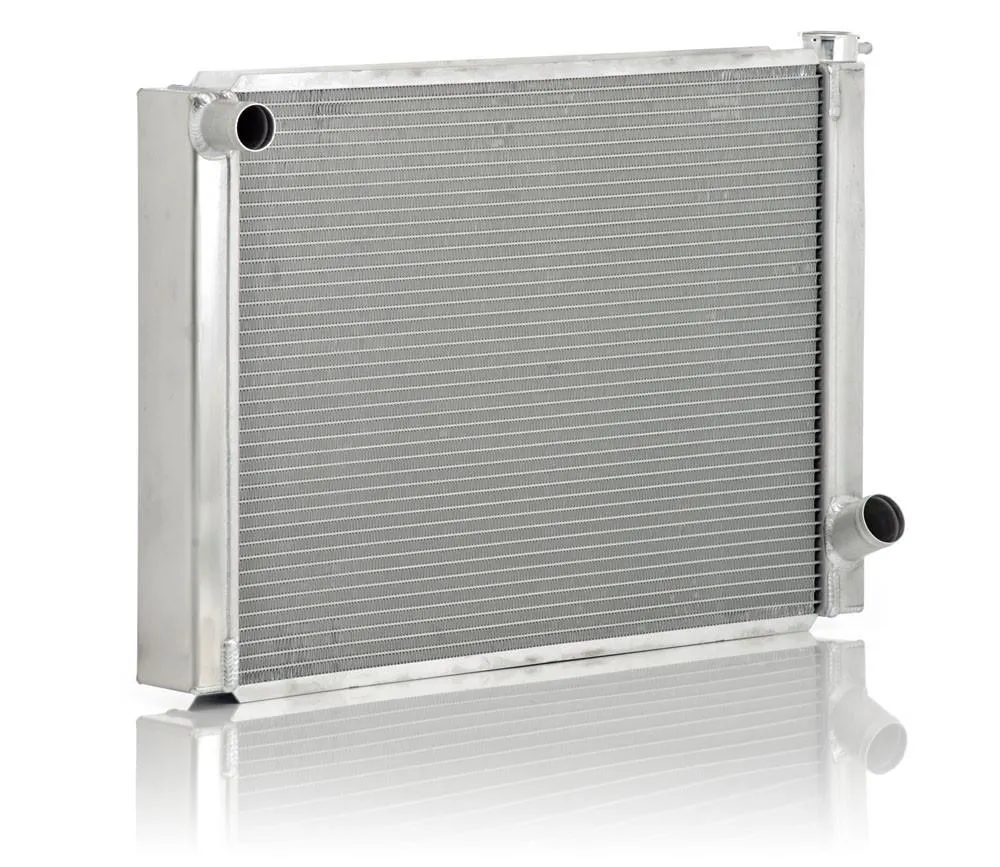 GM Circle Track Single Pass Crossflow Radiator Dual 1 Inch Core Form Folded and Tapered Tanks Twist Resist Upper and Lower Core Rails Billet Filler Neck w/High Capacity Overflow Tube Aluminum Construction Natural Finish Sold Individually SKU: 35013 Specifications: Height: 19 Inches Length: 26 Inches Core Thickness: 2 Inches Core Width: 22.5 Inches Tank Depth: 3 Inches Inlet: 1.5 Inches Outlet: 1.75 Inches