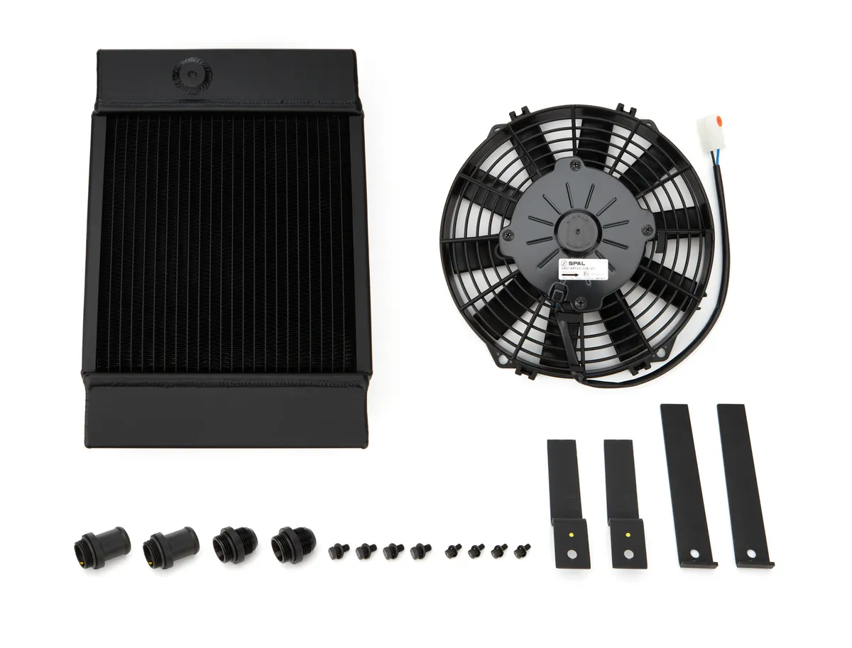Click Here for the Full Press Release & Additional Product Details After more than 9 months of R&D, and input from some of the best import drag race builders in N. America, CSF has brought to the sport compact market the most advanced drag race cooling system ever developed. Introducing the KING Cooler. Since the launch of CSF's industry-leading line of tuck radiators exclusively for Rywire , calls had been coming into CSF to produce a similar universal item for the import drag race market (SFWD). After working with industry leaders such as Sheepey Built , Whitfield Manufacturing , and JRP Canada , CSF was able to use its industry-leading technology to come up with a universal solution that is now in stock and readily available through CSF's distribution and dealer network around the globe. Product Details For the longest time, buying a drag-race radiator was a tasking process. End users had to custom order the unit based on their connection and mounting specifications. Typically, this process would take 2-4 weeks and be rather expensive. CSF has eliminated this hassle by making sure that these units are in stock in both of CSF's coastal warehouses and on the shelves of distributors and supporting dealers around the world. Universal Fit Allows for Mounting in Multiple Different Configurations. Due to the advanced features and heat-transfer technologies of the KING Cooler, it allows it to be used in many different types of racing and on-road vehicles. Including, but not limited to; Go-Karts, drag race, short course, auxiliary heat exchanger needs, off-road, and industrial/agricultural. Design & Engineering This radiator features a 3.5-inch thick 2-Row core with CSF's exclusive B-Tube Technology : Unlike a regular oval-shaped "O" type radiator tube, CSF uses a specially engineered tube in the shape of a "B". These "B-tubes" are carefully formed and then brazed over the seam to seal. CSF is able to use thinner and lighter aluminum material (with better cooling efficiency) because this design is actually stronger than normal "O" shape tubes that are welded. The end tanks are designed with 1 5/16"-12 threaded bungs accepting included 1.25-inch slip-on fittings and -16 inlet/outlet fittings. This allows for easier setup on different applications in addition to more customization options. The radiator also Includes a 9-inch 590 CFM SPAL Puller Fan (SPAL PN: 3010039) with mounting hardware. The laser cut and TIG welded fan shroud is built into the radiator for optimal airflow. Available with a 1-hour hand polished mirror-finish (#7065) or satin black finish for a high-end stealth look (#7065B) Installed Images SV Racing Team "LA VIUDA NEGRA" Racing Truck Robby Jr's 1985 Honda CRX Si The Legacy EV 240Z by Industry Garage Features 3.5-inch thick 2-row core with CSF's exclusive B-tube technology Threaded bungs accepting 1.25-inch slip-on fittings and -16 inlet/outlet connections (Kit included) Threaded Bung size and thread pitch: 1 5/16" x 12G Drain Plug Bung size and thread pitch: M12 x 1.5p Universal mounting brackets included Includes 9-inch SPAL fan Black Finish for High-End Stealth Look Overall dimensions: 14.5H x 10.0L x 3.6W (5.65W with a fan installed) Weight: 8.0 lbs (3.6 kg)