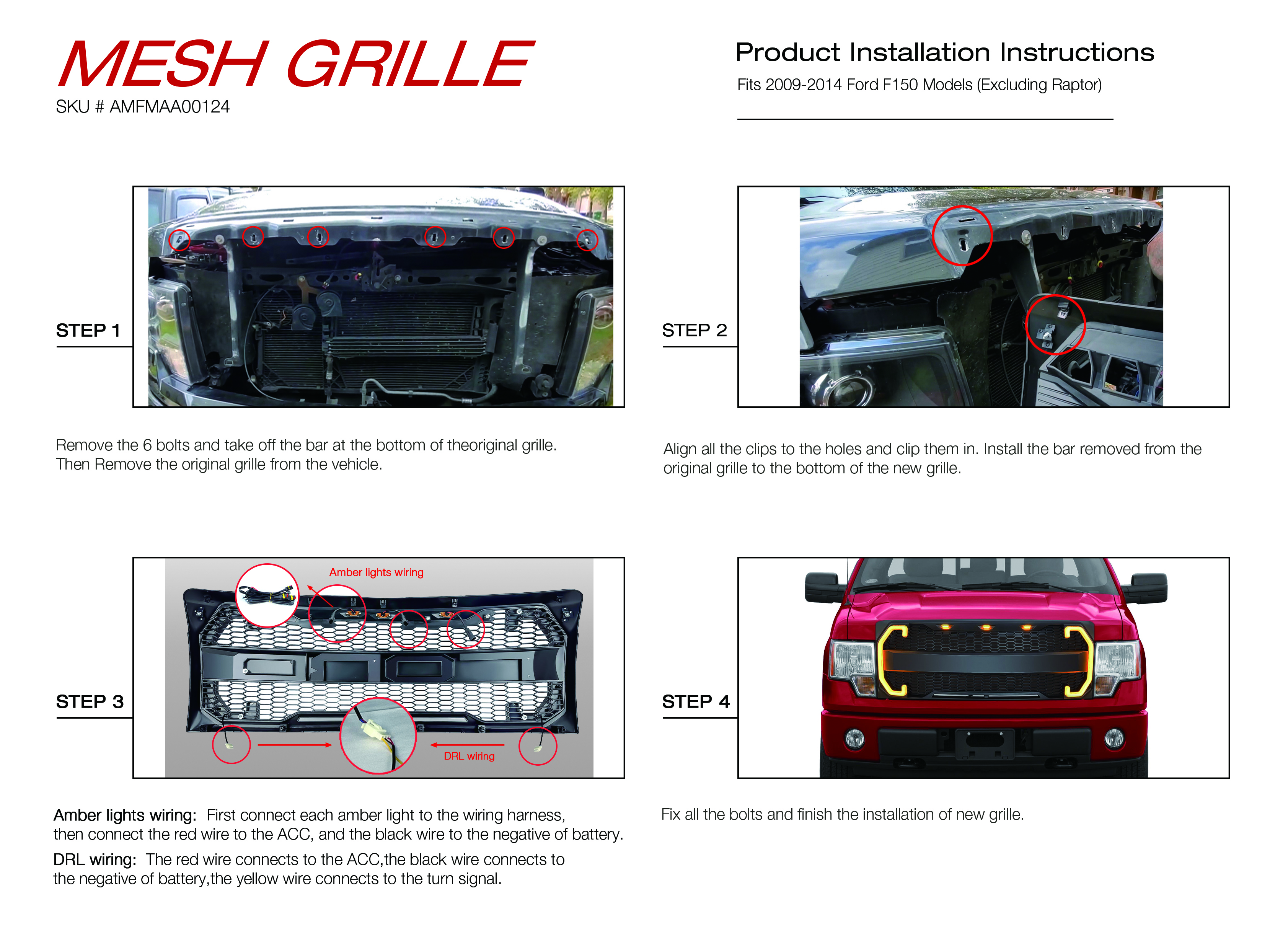 Video Product Specification Part# AMFMAA00124 Package Dimensions: 49.61*19.69*8.27 inch Package Weight: 13.34 Ibs Features Unique American Modified Style Give Your Truck An Aggressive Look Honeycomb Mesh Design To Increases Air Flow To Radiator Daytime Running Lights W/ Start Up Dynamic Animation & Turn Signal & 3 Amber Running Lights Made Of High-quality ABS Plastic Material Simple Straight Forward Installation Matte Black Finish Fits 2009-2014 Ford F150 Models ( Excluding Raptor ) Descriptions Give Your Truck An Aggressive Look : Different from the original grille,t his American Modified Matte Black Mesh Grille with DRL & Turn Signal Lights will give your truck a new and aggressive appearance.