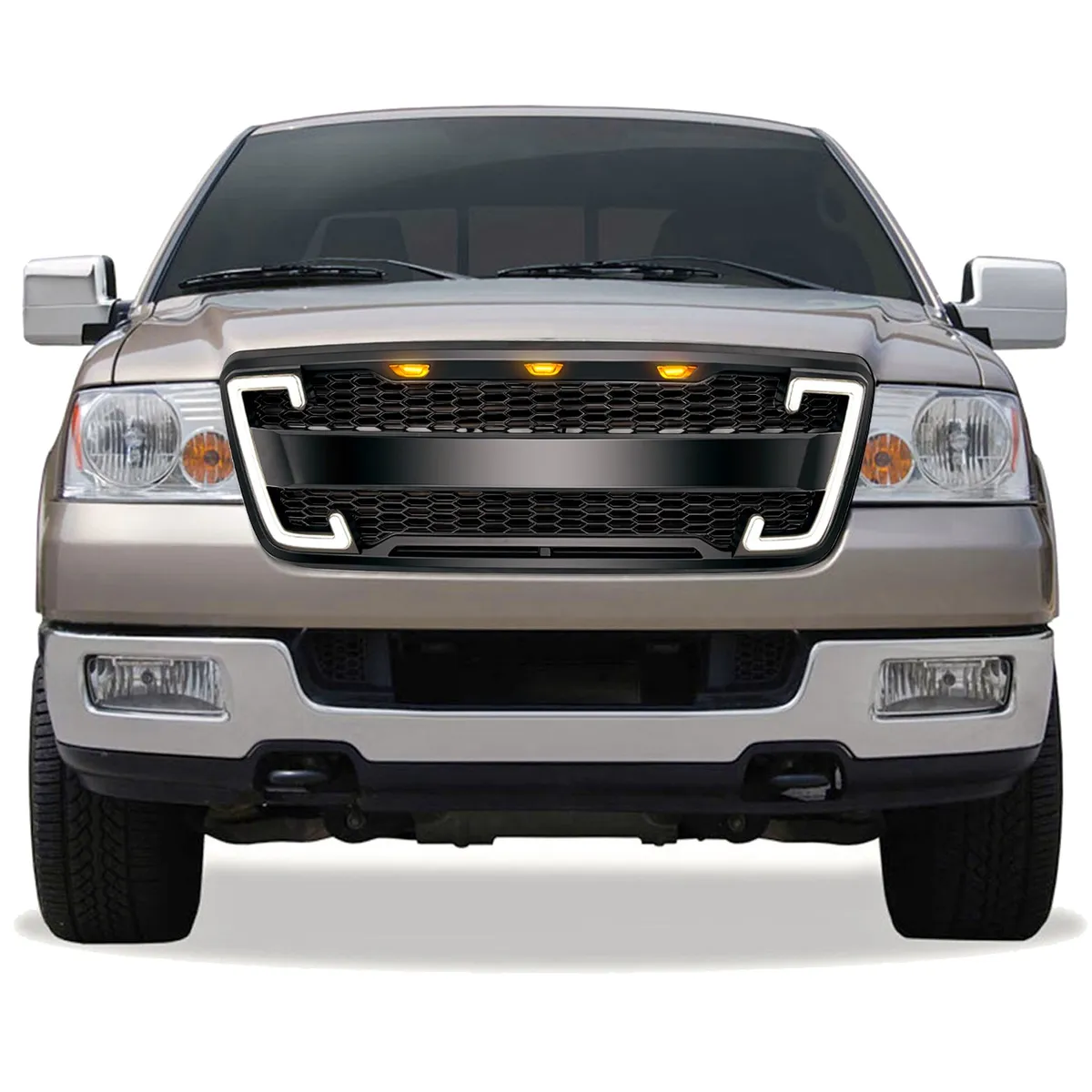 - No Cutting Required Matte Black Finish Fits 2004-2008 Ford F150 Models ( Excluding Raptor ) Descriptions Give Your Truck An Aggressive Look Design: Different from the original grille,t his American Modified Matte Black Mesh Grille with DRL & Turn Signal Lights will give your truck a new and intimidating appearance.