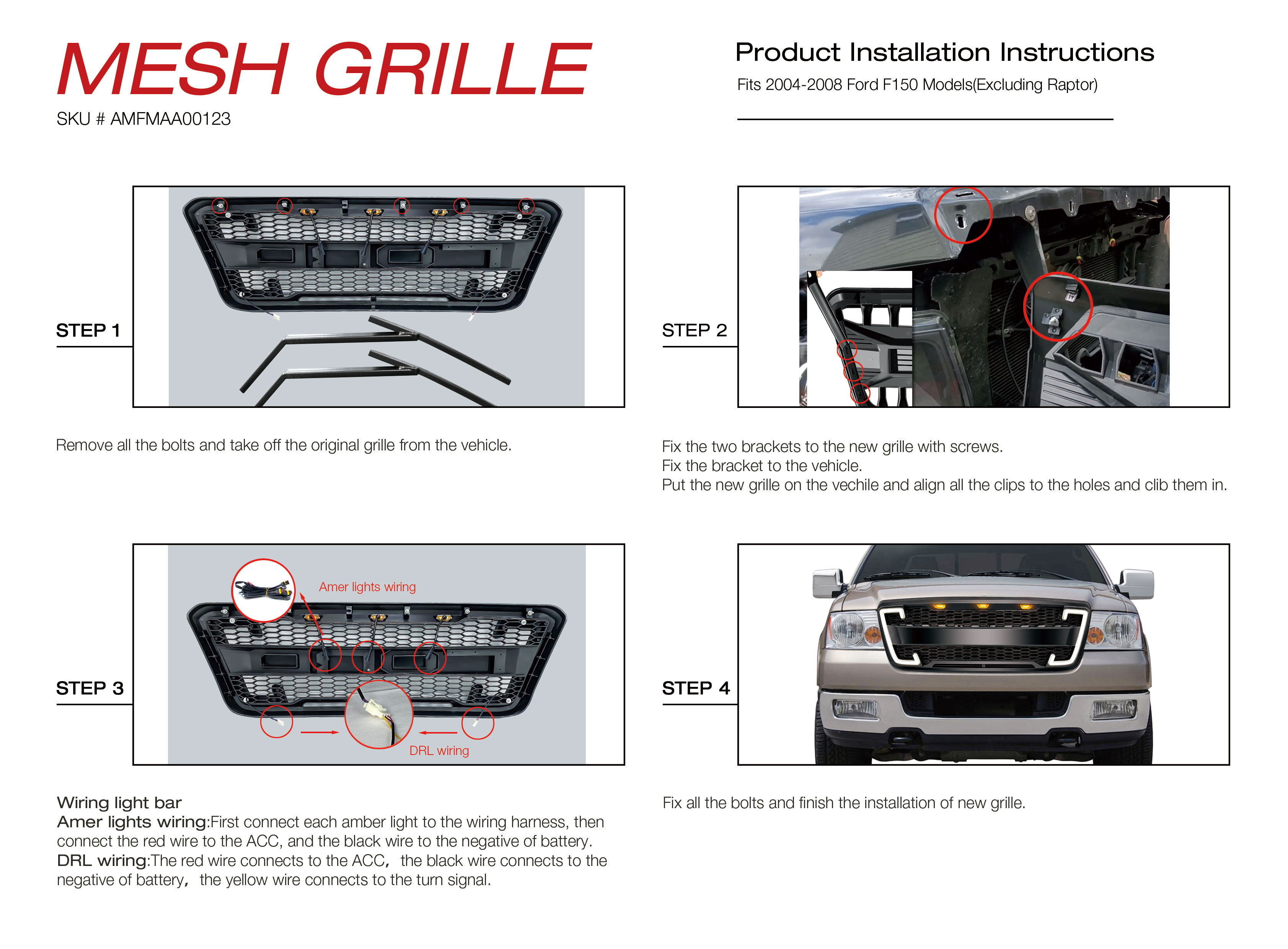 No cutting, no drilling required. Pre-drilled holes perfectly match with your PICKUP, simply unscrew your old grill and install the new grill with original bolts Fitment Fits 2004-2008 Ford F150 Models ( Excluding Raptor ) Package 1 x Front Grille ( 3 Amber LED Lights + DRL Turn Signal Lights + Wire Harness )