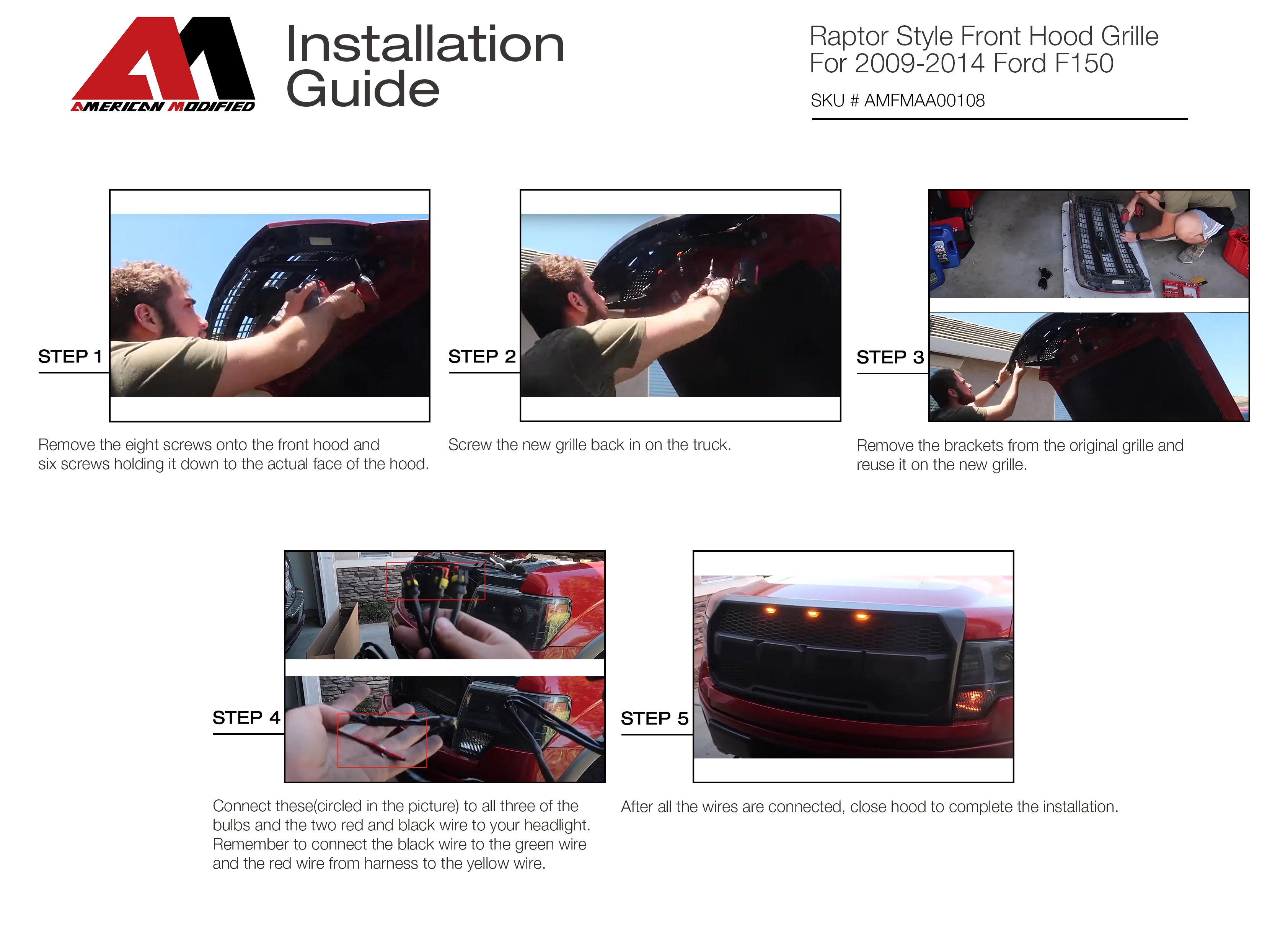 Direct bolt-on replacement, it is a direct OEM fitment, just unscrew your old grill and screw this one in with existing bolts. Fitment Compatible For Ford F150 2009-2014 ( Not Fit SVT Raptor ) Some Modification Will Have To Be Made To Add Front Camera Package 1 x Matte Black F150 Grill ( Excluding Letters ) 3 x Amber Led Lights 1 x Harness Disclaimer Grille Spells Out EOMD