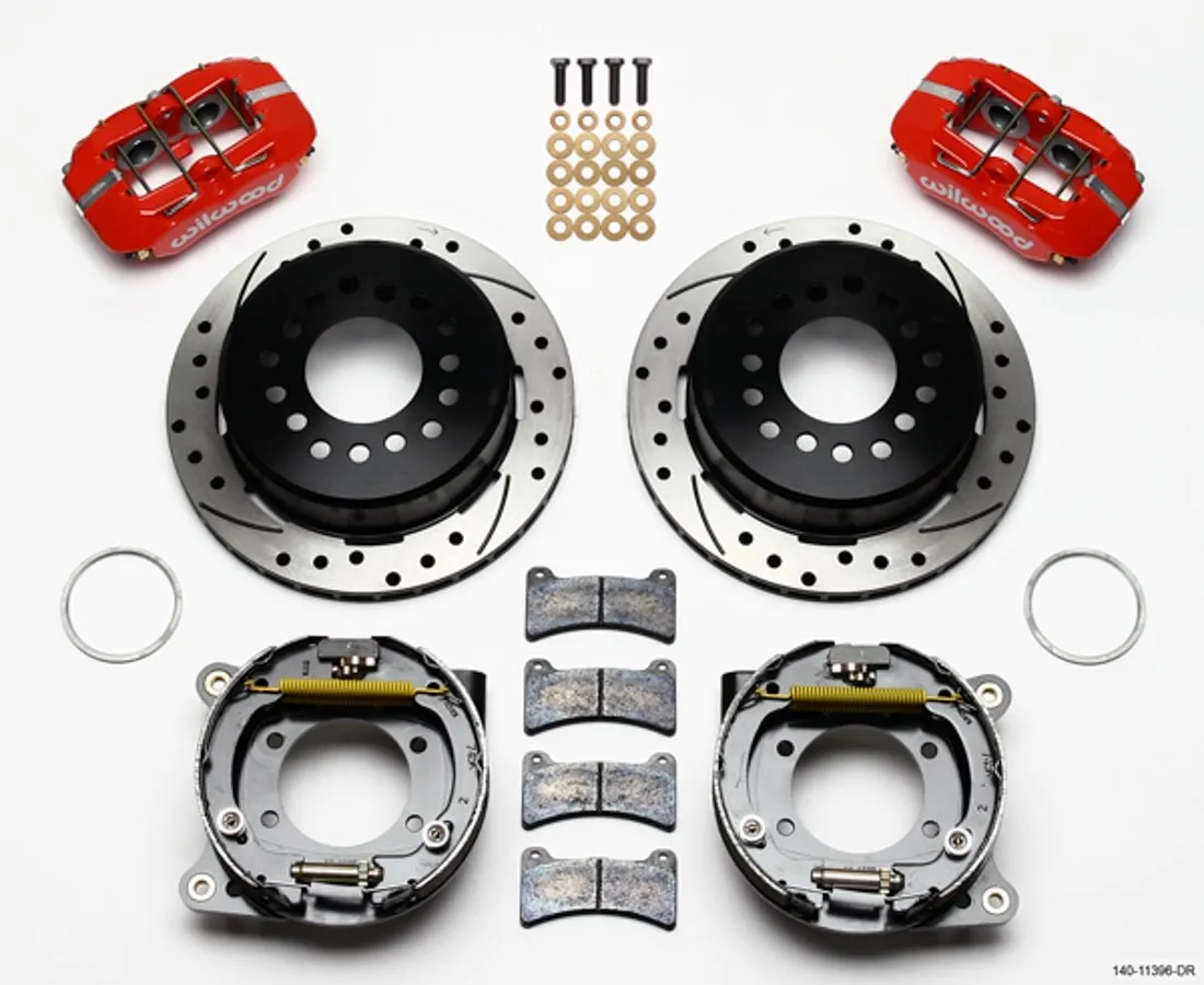 Brake System - Dynapro Low-Profile - Rear - 4 Piston Caliper - 11.00 in Drilled / Slotted Iron Rotor - Parking Brake - Aluminum - Red Powder Coat - Ford 8.8 in - Kit