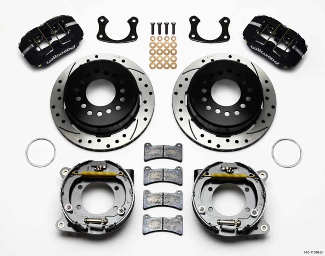 Brake System - Dynapro Low-Profile - Rear - 4 Piston Caliper - 11.000 in Drilled / Slotted Iron Rotor - Parking Brake / Offset Hat - Aluminum - Black Powder Coat - Big Ford - Kit