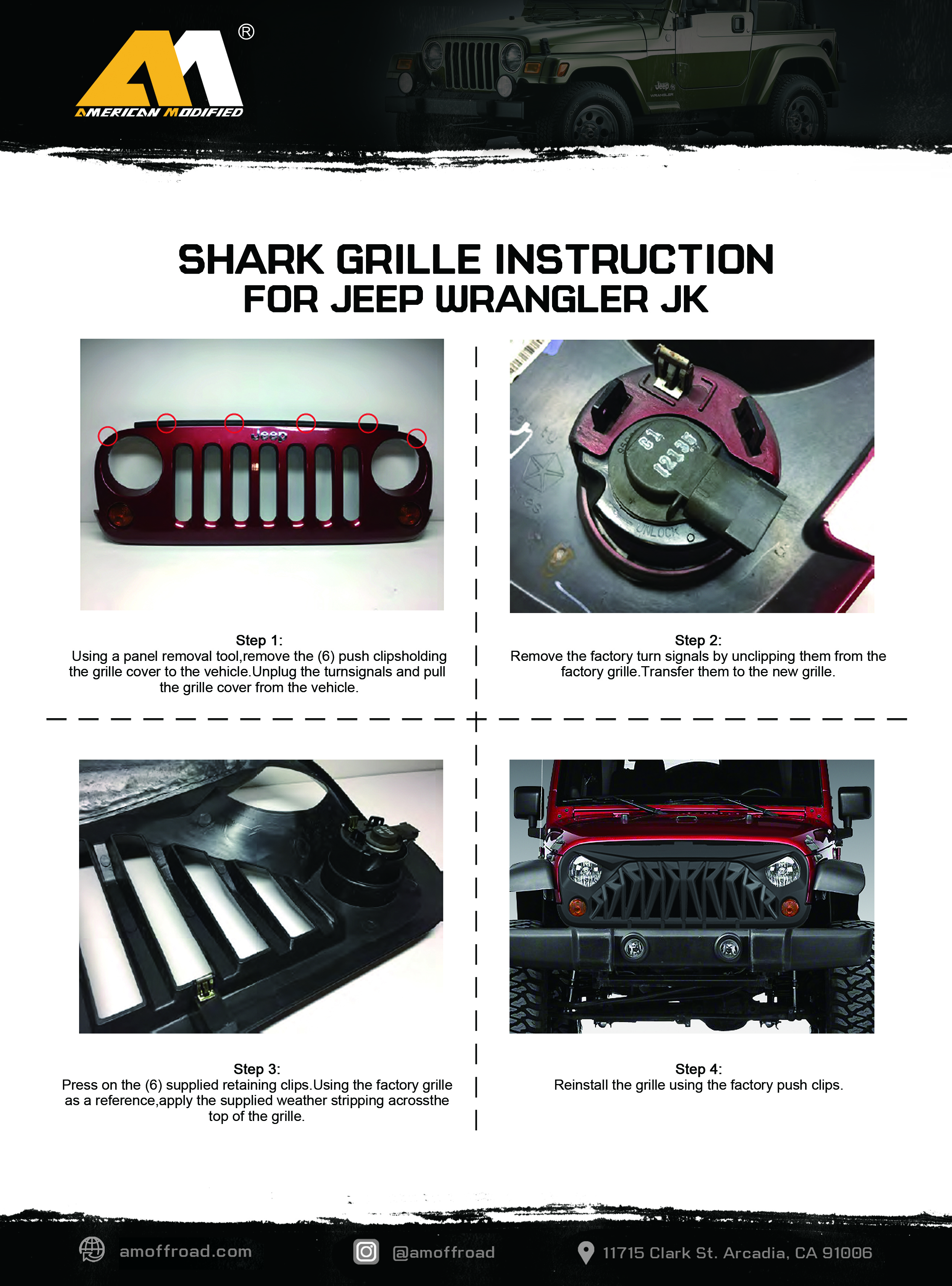 Takes about 15 minutes and all holes are aligned so no drilling is required. Uses your existing grill bolts and clips to fasten to your Jeep. Fitment For All 07-18 Wrangler JK/ JKU Package 1 x AMERICAN MODIFIED White & Black Shark Grille