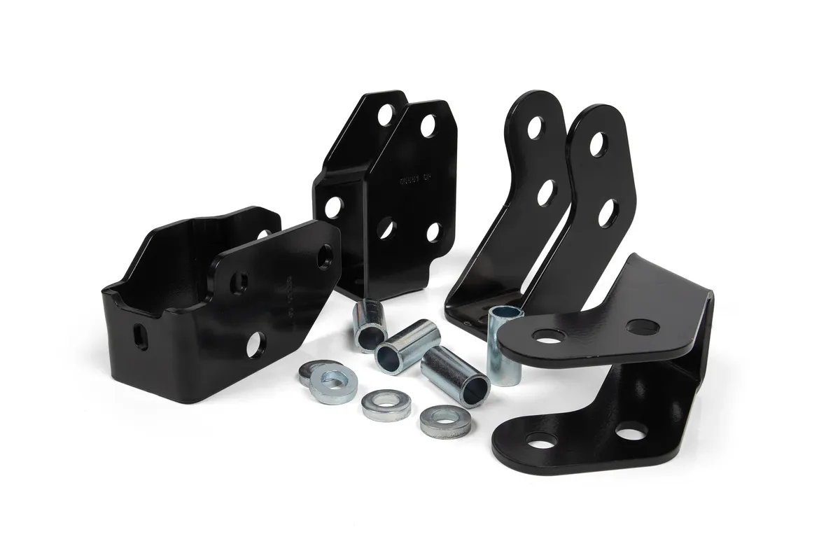 Extend the shock mounts on your Jeep JT Gladiator Mojave with these JKS Front and Rear Shock Extension Brackets. The heavy duty design extends the factory shock mounts to allow the use of factory shocks with up to 2.5" of lift. Durable powder coated finish provides excellent corrosion resistance. Easy, bolt-on installation requires no modifications. Features & Benefits Maximizes available droop travel while retaining OE JT Mojave FOX IBP shocks at 0-2.5"" of lift. 3/16" steel design provides great strength and durability. Bolt-on for easy install. Important Notes For use on JT Mojave models only. Can be used with up to 3.5" of lift, however this will limit suspension down travel slightly.