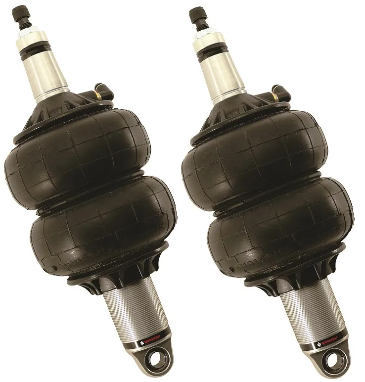 The ShockWave is very similar to a CoilOver spring/shock assembly. Our CoilOvers and ShockWaves both use the same great monotube shock cartridge and offer damping adjustment. Both offer ride height adjustments. In many cases, RideTech CoilOvers are interchangeable W/ RideTech ShockWaves. The main distinction between CoilOvers and ShockWaves is that the metal coilspring is replaced W/ a pressure adjustable air spring. ShockWaves allow for electronic ride height adjustments at the push of a button. Front HQ Shockwaves 1000 Series W/ 3.6 Inch Stroke And 2 Inch Stud A Pair Of Rebound Adjustable Shockwaves 6.5 Inch Double Convoluted W/ 1/4 Inch Fittings And Bearing Spacers 1/2 Inch And 5/8 Inch. 10.3 Inch X 13.3 Inch W/ A 11.75 Inch-12 Inch Ride Height..