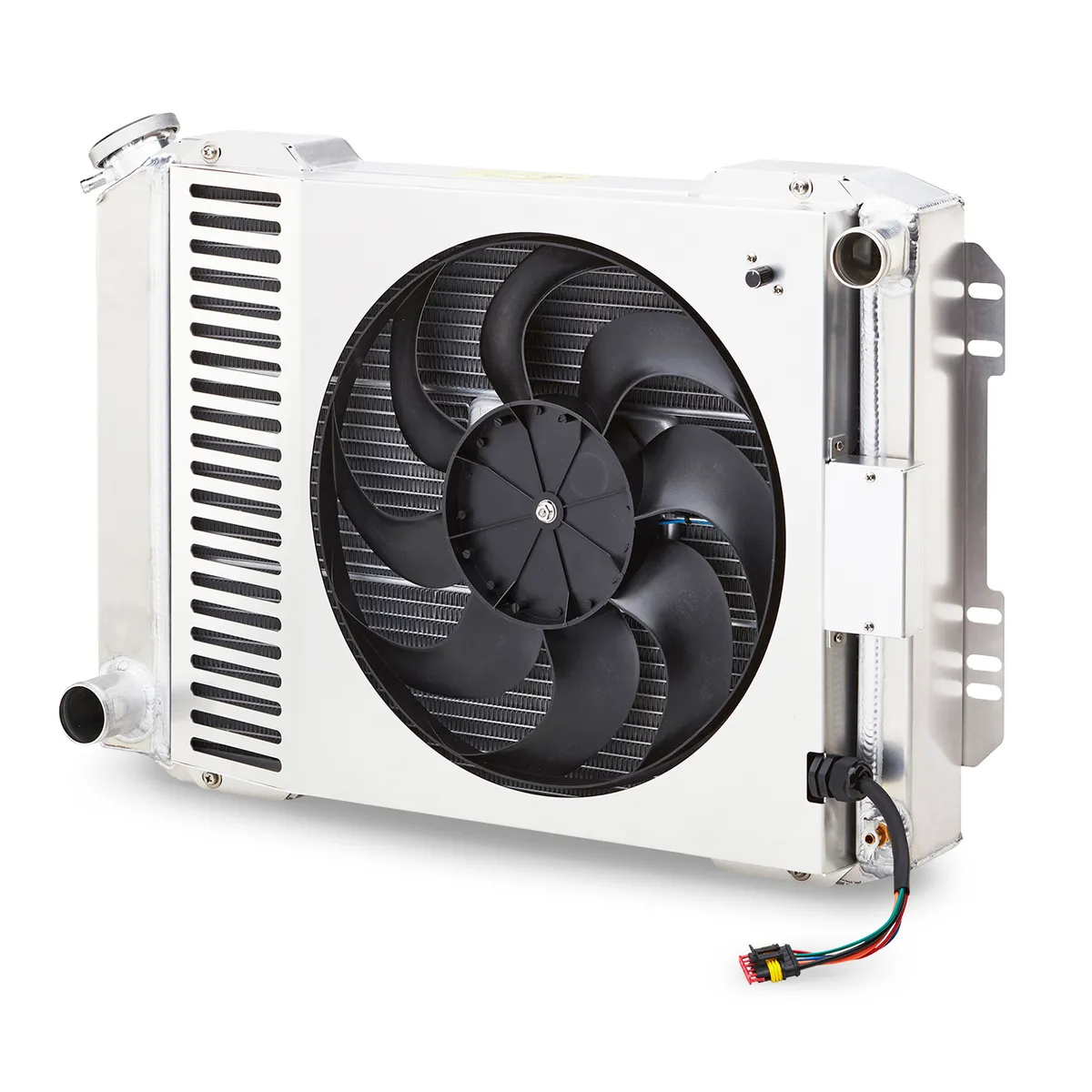 Radiator and Shrould Less Than 4 inch Thick Integrated Radiator/Shroud/Fan System Adjustable Thermostat 100 percent Fabricated Aluminum Tanks Hybrid Extruded Tube Core Technology Billet Aluminum Filler Neck High-Capacity Overflow Tube Patented Innovation and Design Complete with Band Clamp for Accurate Adjustment Core Height (in): 17 Core Thickness (in): 2.4 Core Width (in): 22 Electric Fan(s) Included: Yes Fan CFM: 2100 Finish: Natural Height (in): 18.5 Inlet Diameter (in): 1.5 Inlet Location: Passenger Side Max Recommended Horsepower: 600 Mounting Style: Direct Fit Outlet Diameter (in): 1.75 Outlet Location: Driver Side Overall Width (in) 26.5 Part Type: Radiator Series: Slim-Fit Shroud Included: Yes Transmission Type: Manual Voltage Compatibility: 12