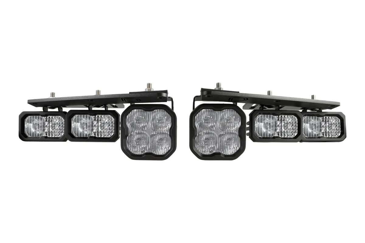 The Stage Series Fog Pocket Kit compatible with Ford Bronco 2021+ from Diode Dynamics allows you to mount two SS3 LED Pods and four SSC2 LED pods in the factory bumper openings.