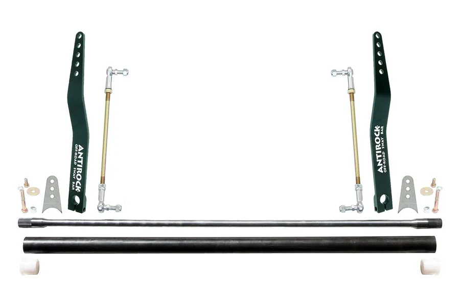 RockJock's Antirock sway bar kits are available in a universal fit configuration for those building their own custom rigs and rock buggies. This universal kit features a 32 Inch torsion bar length and bent 20 Inch long fabricated steel arms. Vertical links use a 14 Inch long 1/2 Inch x .