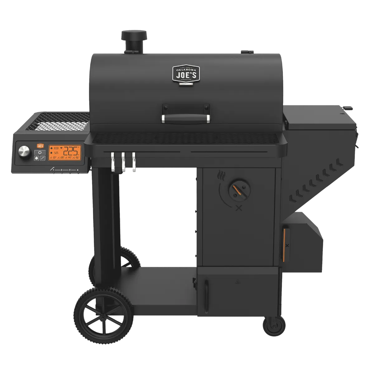 The Oklahoma Joe’s® Tahoma 900A DLX Auto-Feed Charcoal Smoker & Grill (Gen 2) is a smoker and grill combo that brings authentic BBQ flavor together with connected convenience. This outdoor cooking appliance is perfect for controlled cooking, grilling food, outdoor cooking, and smoking meat in the backyard. Fueled by charcoal and hardwood, this charcoal grill with smoker delivers real smoke taste while using digital controls capable of consistent temperature control from low-and-slow smoking to high-heat grilling. Designed to be intuitive for first-time smokers and capable enough for experienced pitmasters, the Tahoma 900A BBQ Oklahoma Joe’s grill and smoker features long burn times, app-connected monitoring, and a spacious cooking surface for everyday cooks or weekend gatherings. With easy cleanup, thoughtful storage, and precise temperature control, charcoal grills like this make authentic BBQ easier to achieve—without sacrificing the craft. There are two rubber-tread wagon wheels and two locking casters provide easy mobility and secure placement. Enjoy a pivoting cool-touch handle that moves naturally with the lid and stays cool during use. Includes a bottom shelf with integrated raised rack keeps charcoal, wood chunks, and accessories neatly stored - backed by a 2-year warranty on all parts. Since 1987, Oklahoma Joe’s has been pioneering the craft of live fire outdoor cooking with a broad selection of BBQ smokers, combo grills, charcoal grills, portable grills, drum smokers, auto-feed charcoal smokers and grills, offset smokers, reverse flow offset smokers, and a range of wood and charcoal fuel, including lump charcoal, charcoal briquettes, wood chips, and wood chunks. Oklahoma Joe’s also offers a full line of grilling and smoking accessories, from BBQ prep and cooking to cleanup. Whether you’re searing a steak to perfection or throwing down a feast for a crowd, Oklahoma Joe’s has everything you need to achieve Real. Smoke. Flavor.