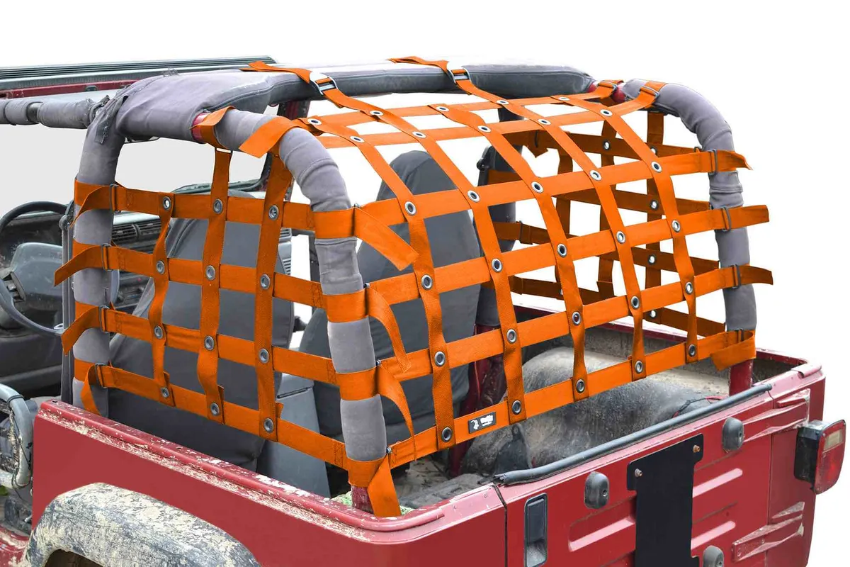Jeep Wrangler TJ Tops and Covers 1997-2006 Cargo Net Orange Make: Jeep Model: Wrangler Years: 1997-2006 This Teddy® Top Cargo Net covers the back half and sides of your TJ. The open design allows for great visibility while keeping your cargo inside the vehicle. The simple, yet effective, double