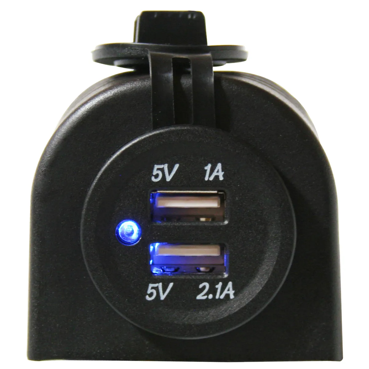 PN: 20287 USB Power Socket Color: Black Sold As: Kit Dual USB Port Power Socket with Cover and 3 Brackets Water-Tight Cap with Tether Includes 3 different brackets for mounting: Flush Mount Bracket Under-Dash Bracket POD Bracket for Mounting on Top of Dash Two Charging Ports: 5V - 2.1A 5V - 1A