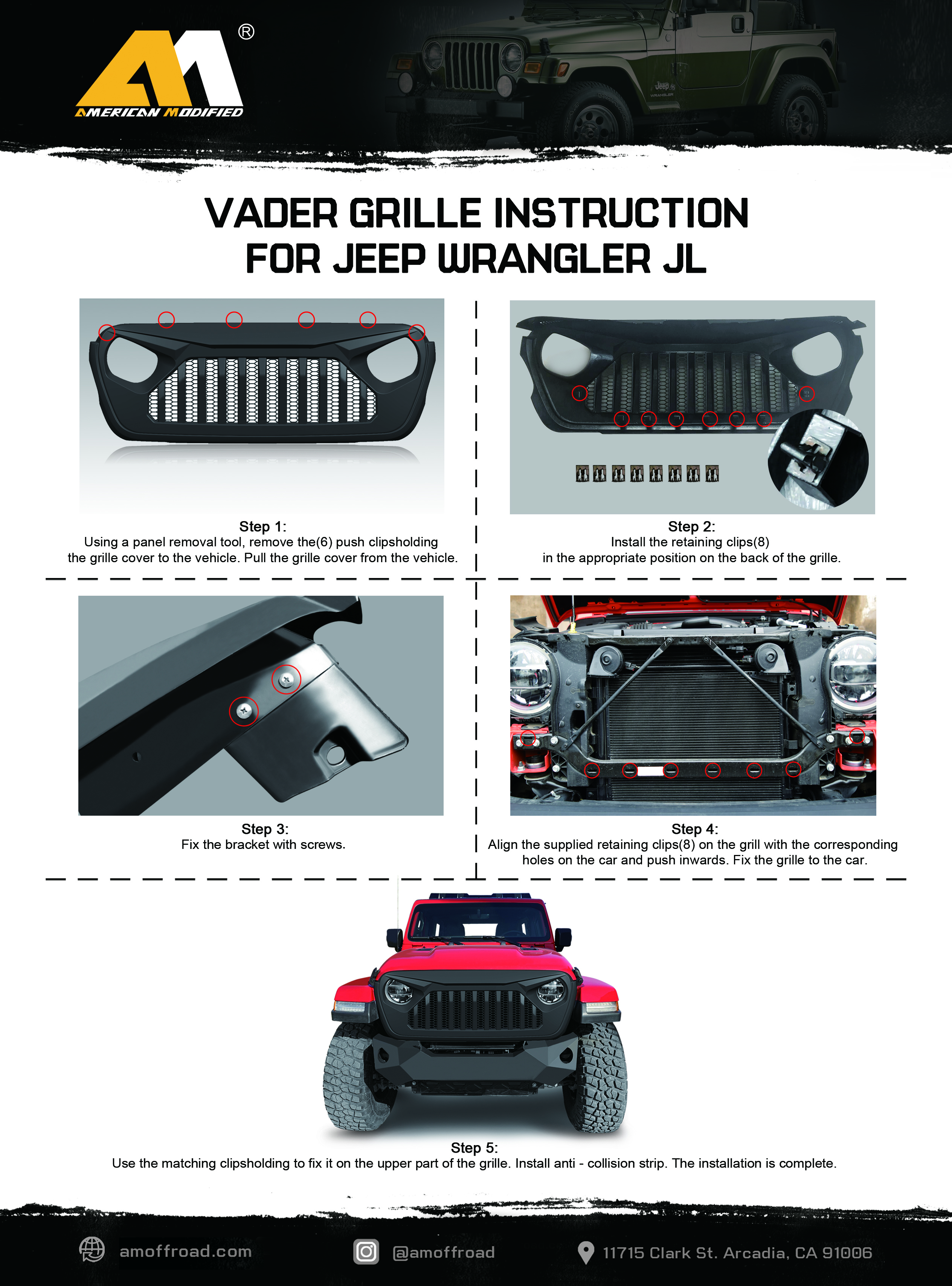 Video Product Specification Part# AMJPCA00106 Package Dimensions: 52.36*18.9*6.3 inch Package Weight: 10.36 Ibs Features AMERICAN MODIFIED Unique Design Give Your Jeep A Stylish Look Aggressive AMERICAN MODIFIED Styling Durable ABS Plastic Construction Easy To Install Fits All 18+ Jeep Wrangler JL & Gladiator JT Models Descriptions American Modified Unique Design: Thanks to its innovative design, the AMERICAN MODIFIED Vader Grille can add different styles to your car. The slightly aggressive appearance allows your car to stand out among the many vehicles.